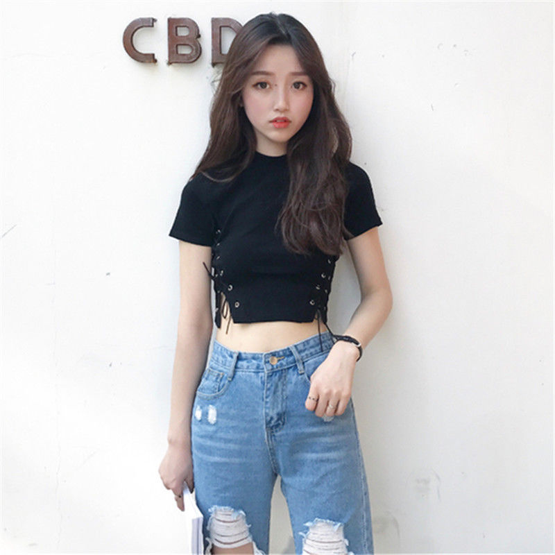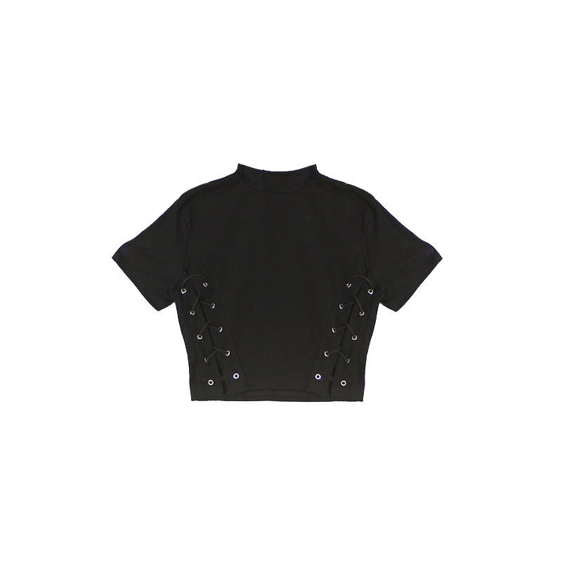 This listing is for a black lace up strap s hort sleeve slim tight crop top. Top comes in one free size . Please double check measurements before purchase.