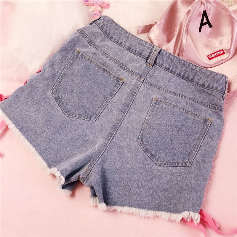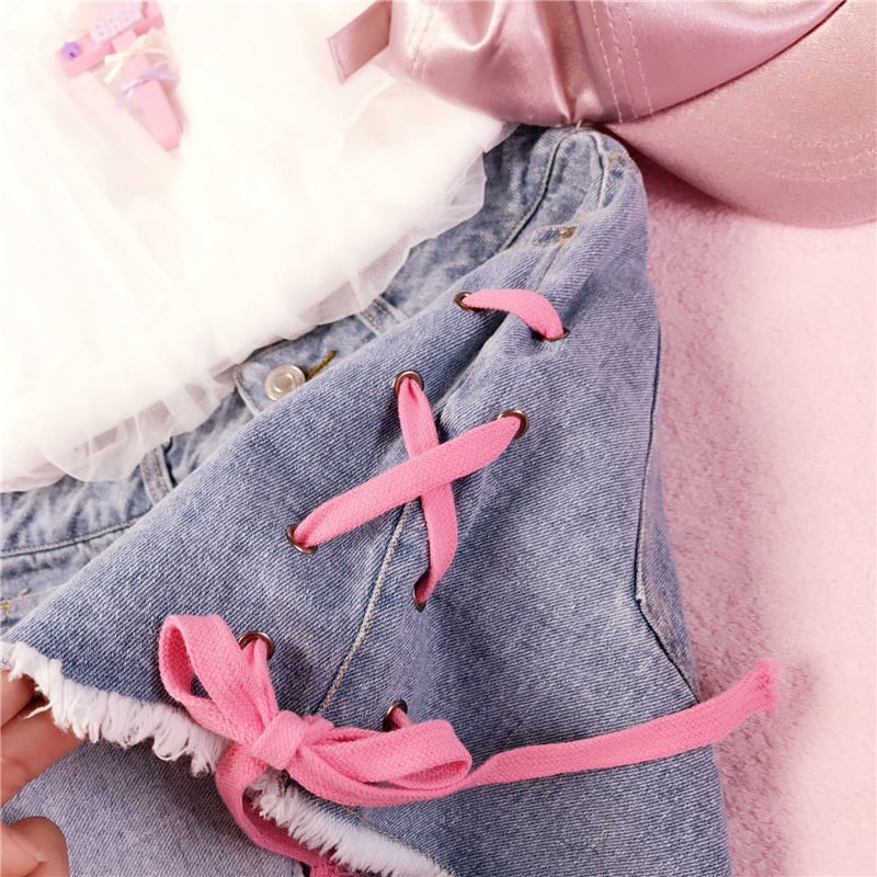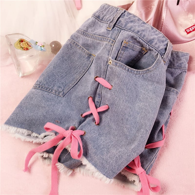Pink lace up denim shorts