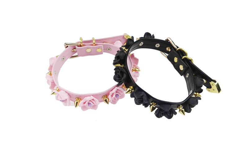 Roses are made of polymer clay, choker made of faux leather. Choose from rose gold spikes or silver spikes.