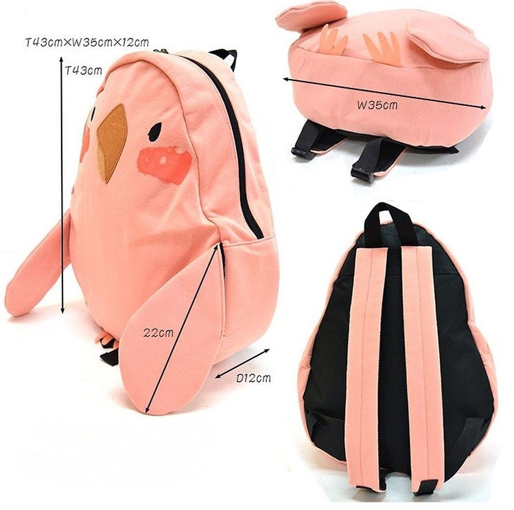 This is a very kawaii color parrot shaped backpack. Backpack holds big volume and can fit A4 size magazine with soft nylon canvas material on back and multiple compartments including smart phone inside compartment.