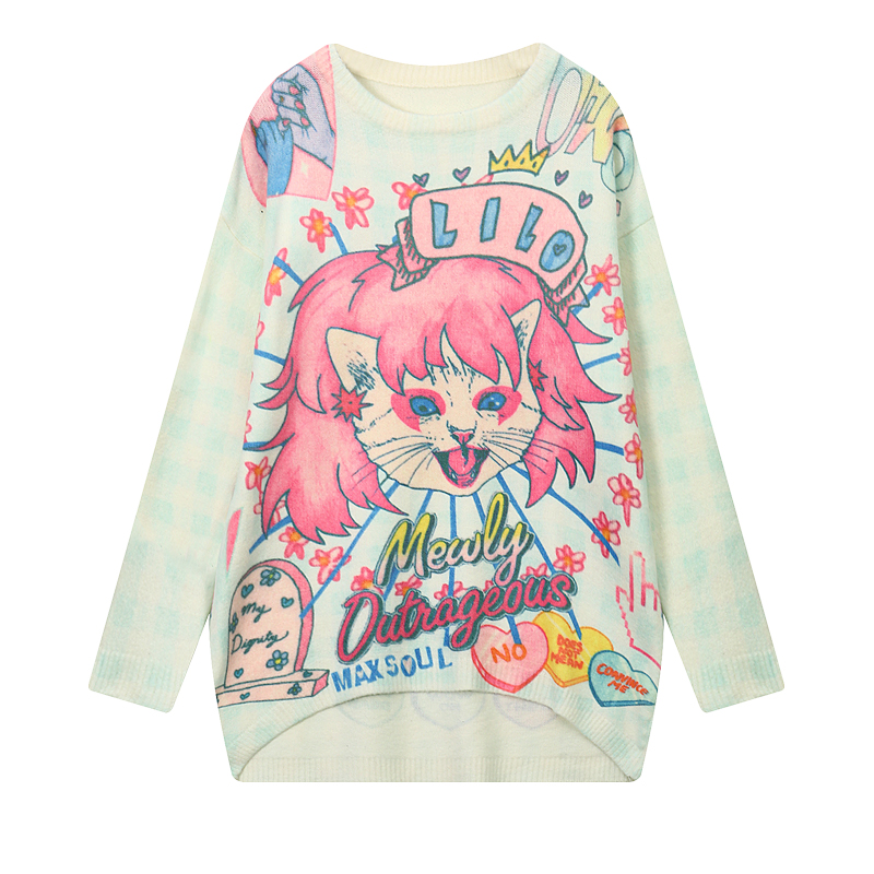 This is a Harajuku style punk rock cat printed sweater. Color is pastel, which is fairy kei style.