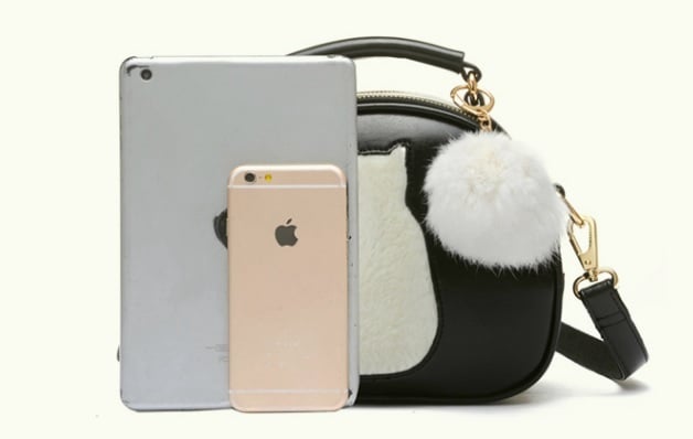 Super cute small size furry cat shoulder bag. Fur ball is made of faux fur included with the bag.