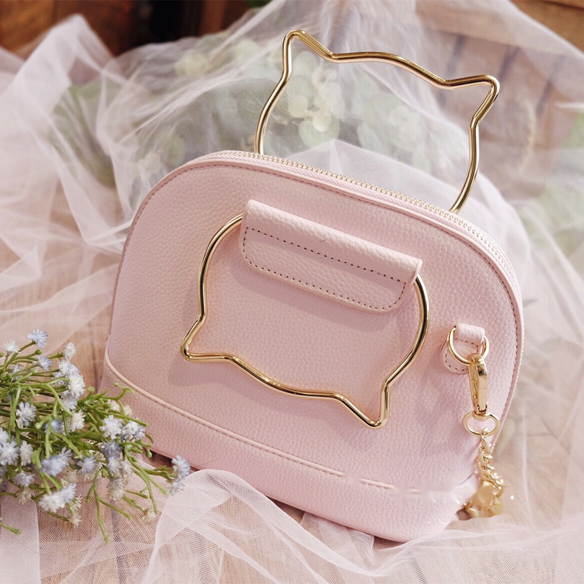 This Lolita style small shoulder bag's handle is made of cat shape. Super kawaii! Bag has one inside zipper compartment.