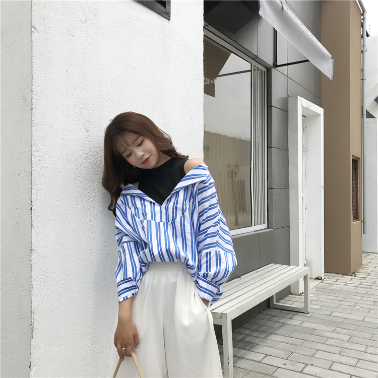 This blouse is a one piece cold shoulder top that looks like a tank top and a striped blouse. There is zipper on back.