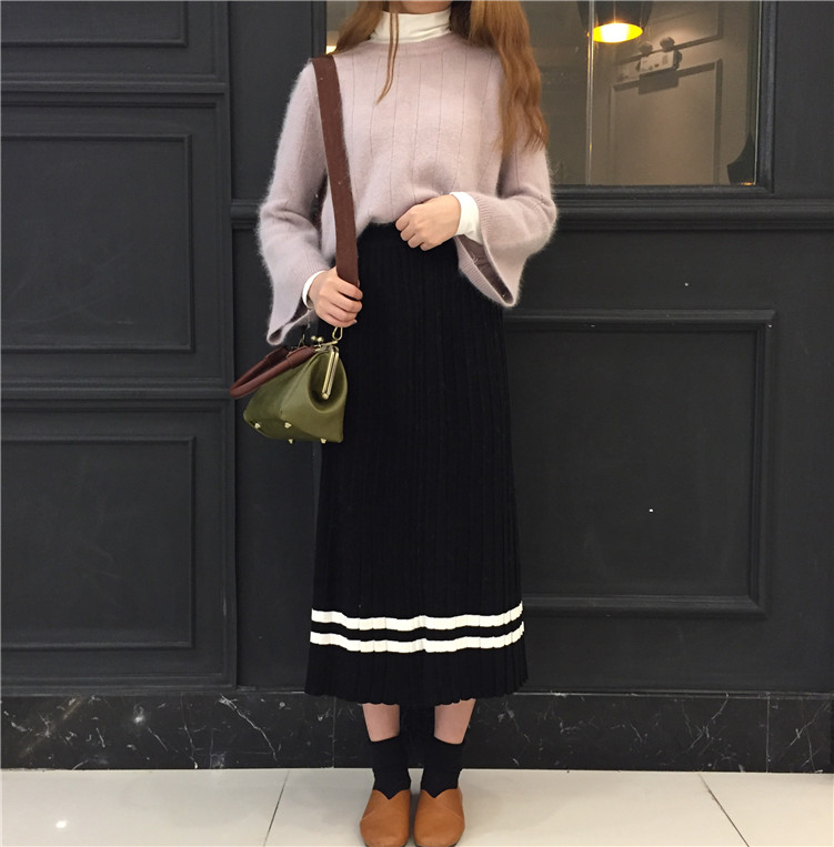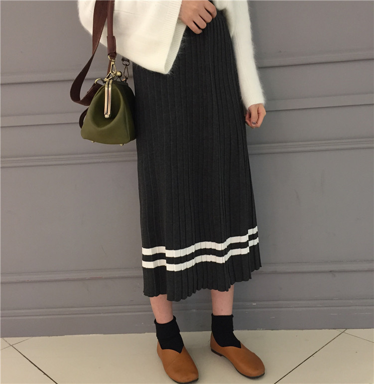 Korean striped pleated midi skirt