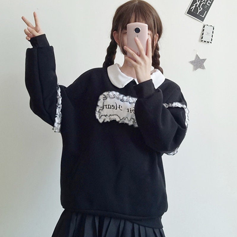 This is a kawaii dolly blouse style sweatshirt. Sweatshirt comes in 2 colors one free size loose fit. Great for winter. Please double check measurements before purchase.