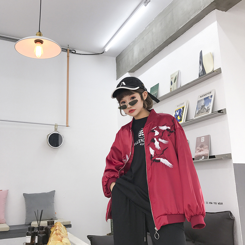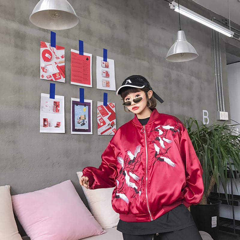 This jacket is shiny and beautifully embroidered with Japanese crane. Unisex, choose from red/black.