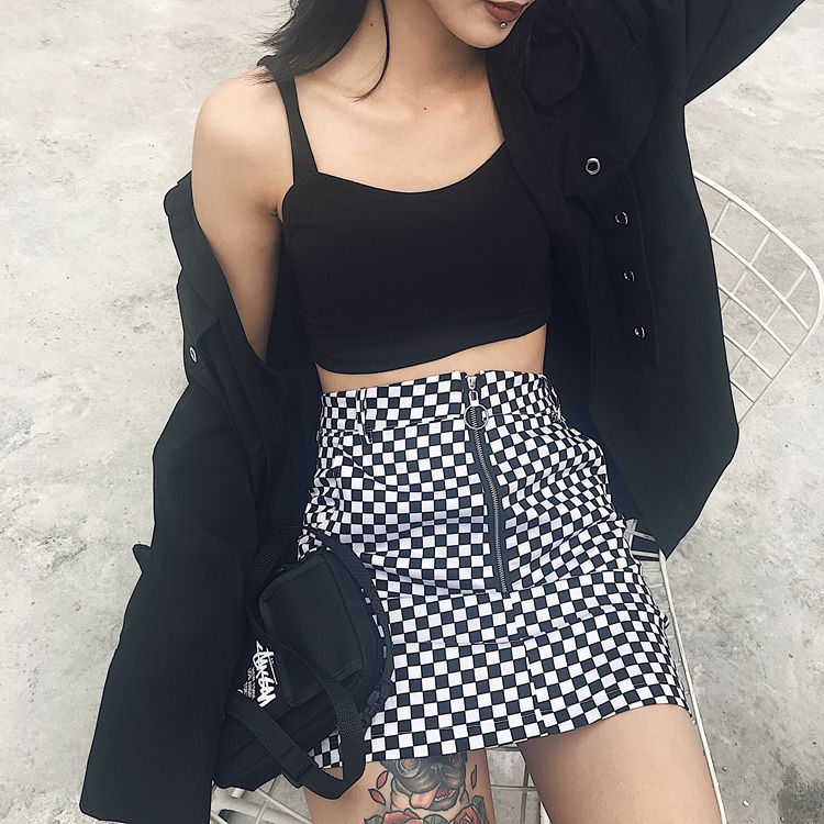 This is a stylish a line checkered plaid black & white zip up skirt. Choose from size S-L.