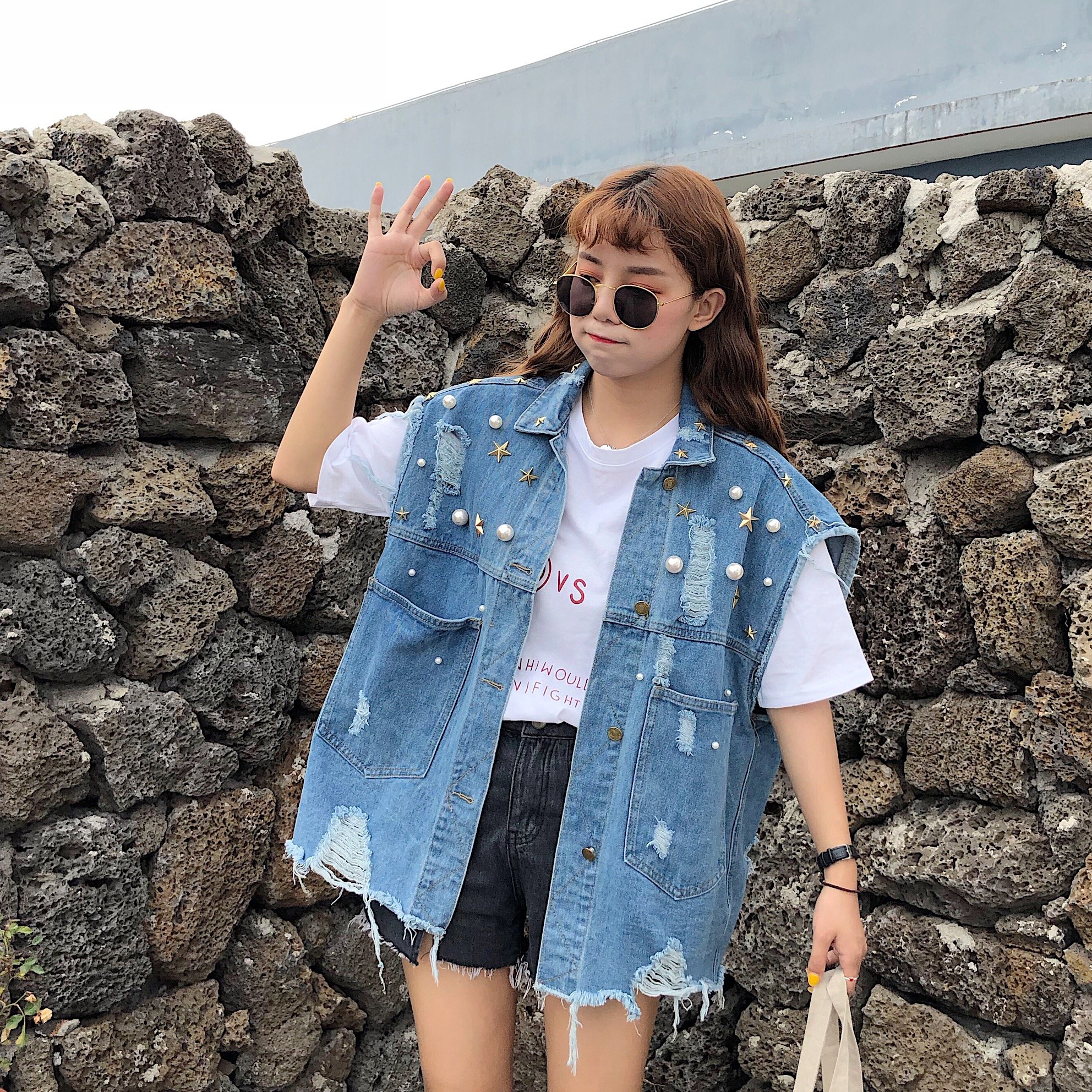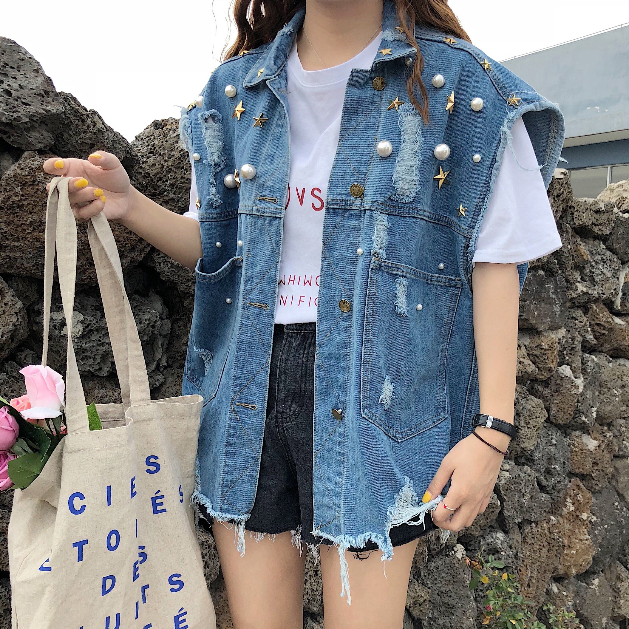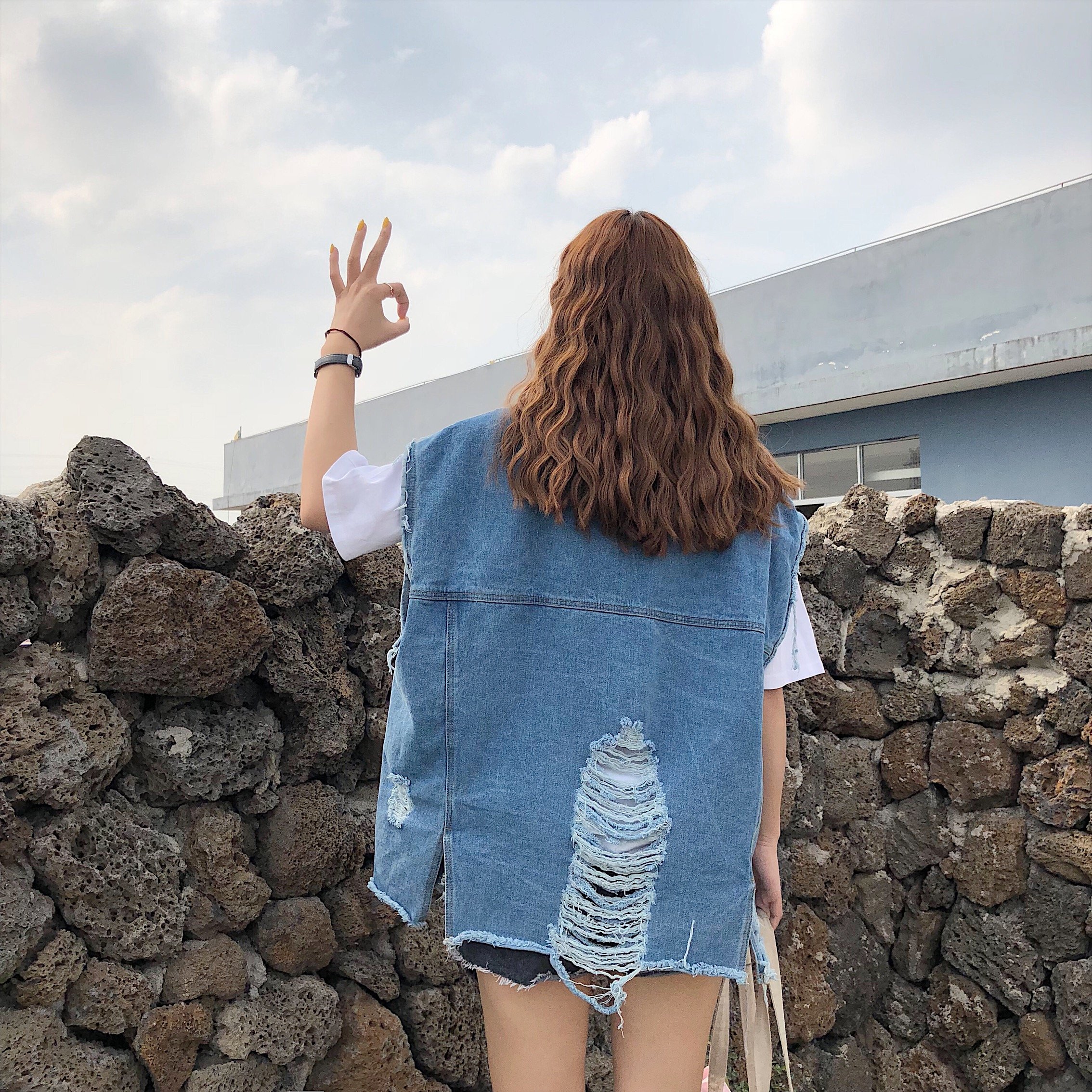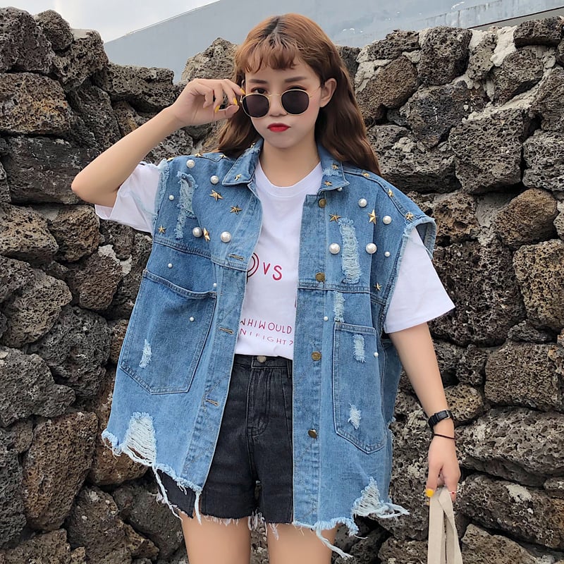 This sleeveless ripped denim jean jacket looks super cool with t-shirts.
