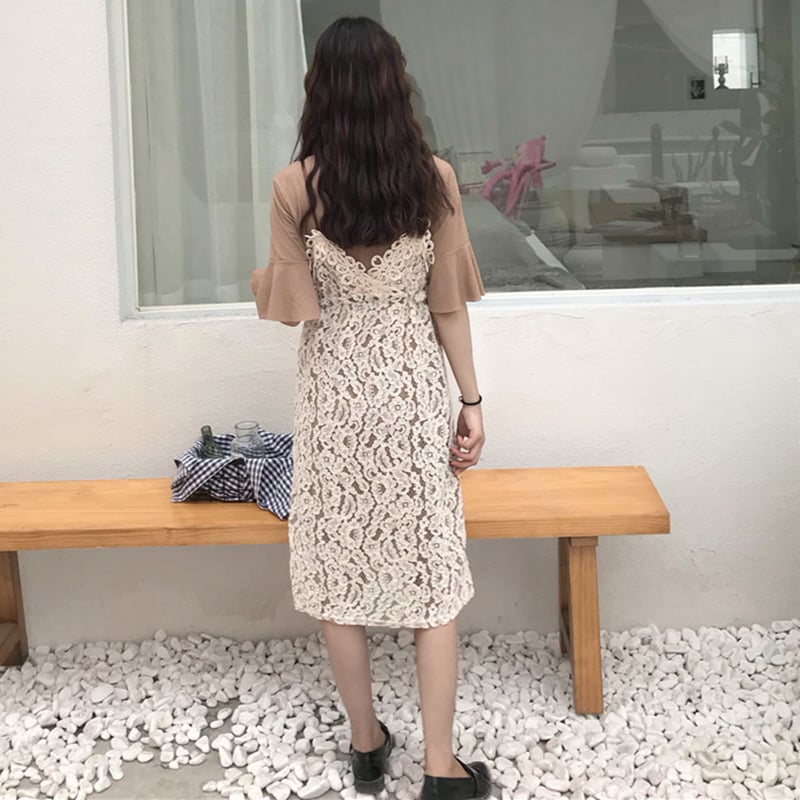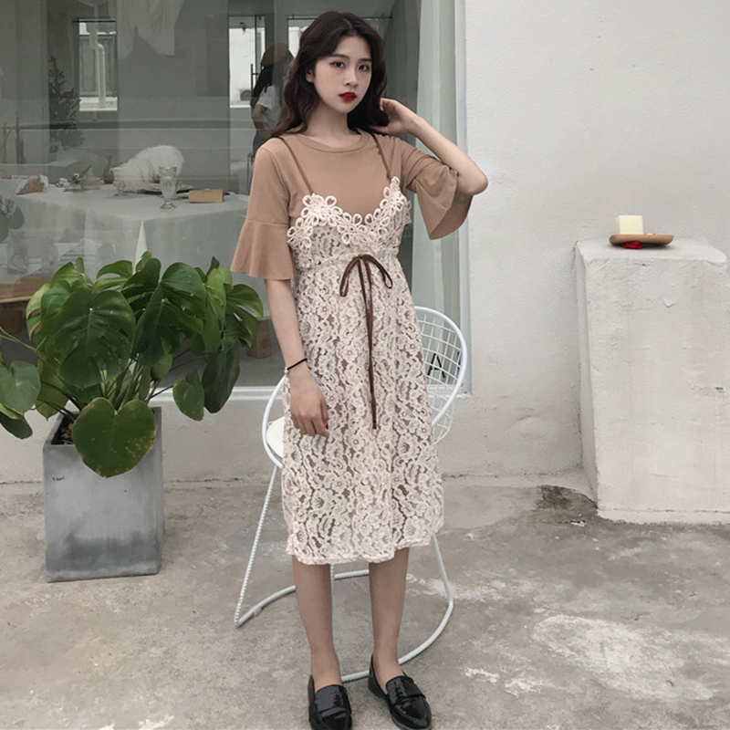 Material: cotton blend, lace Measures: t-shirt length 80 cm, bust 84 cm, sleeve 28 cm, shoulder 36 cm, lace dress with strap 102 cm, bust 88 cm