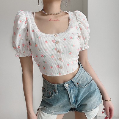 Vintage floral print puffy sleeves top